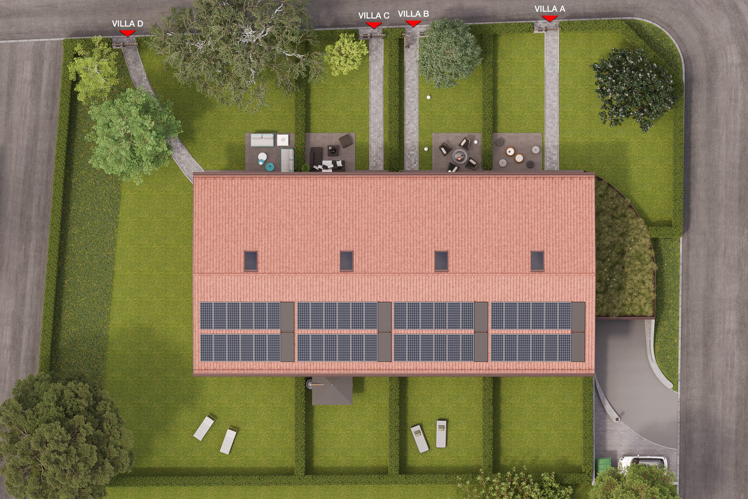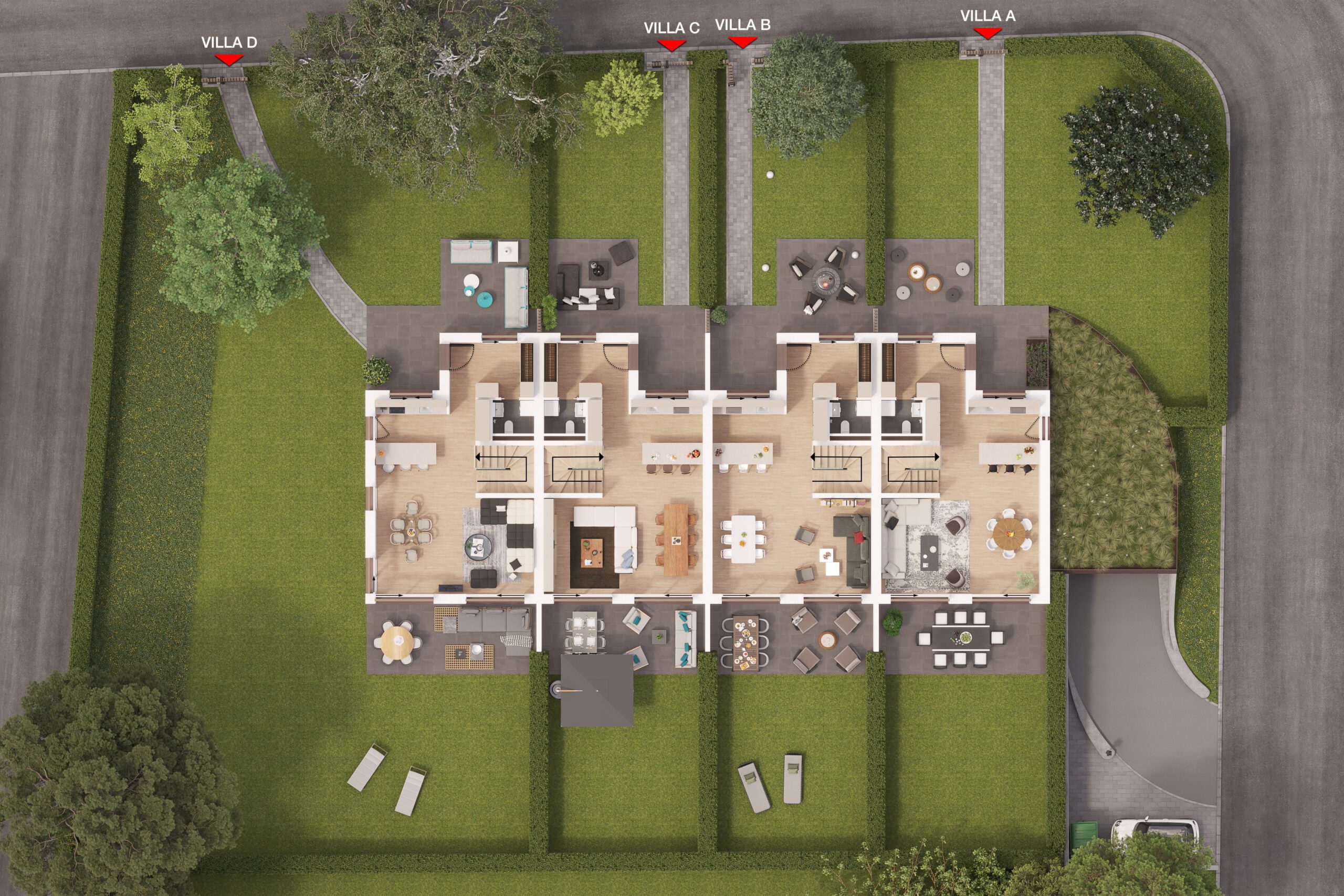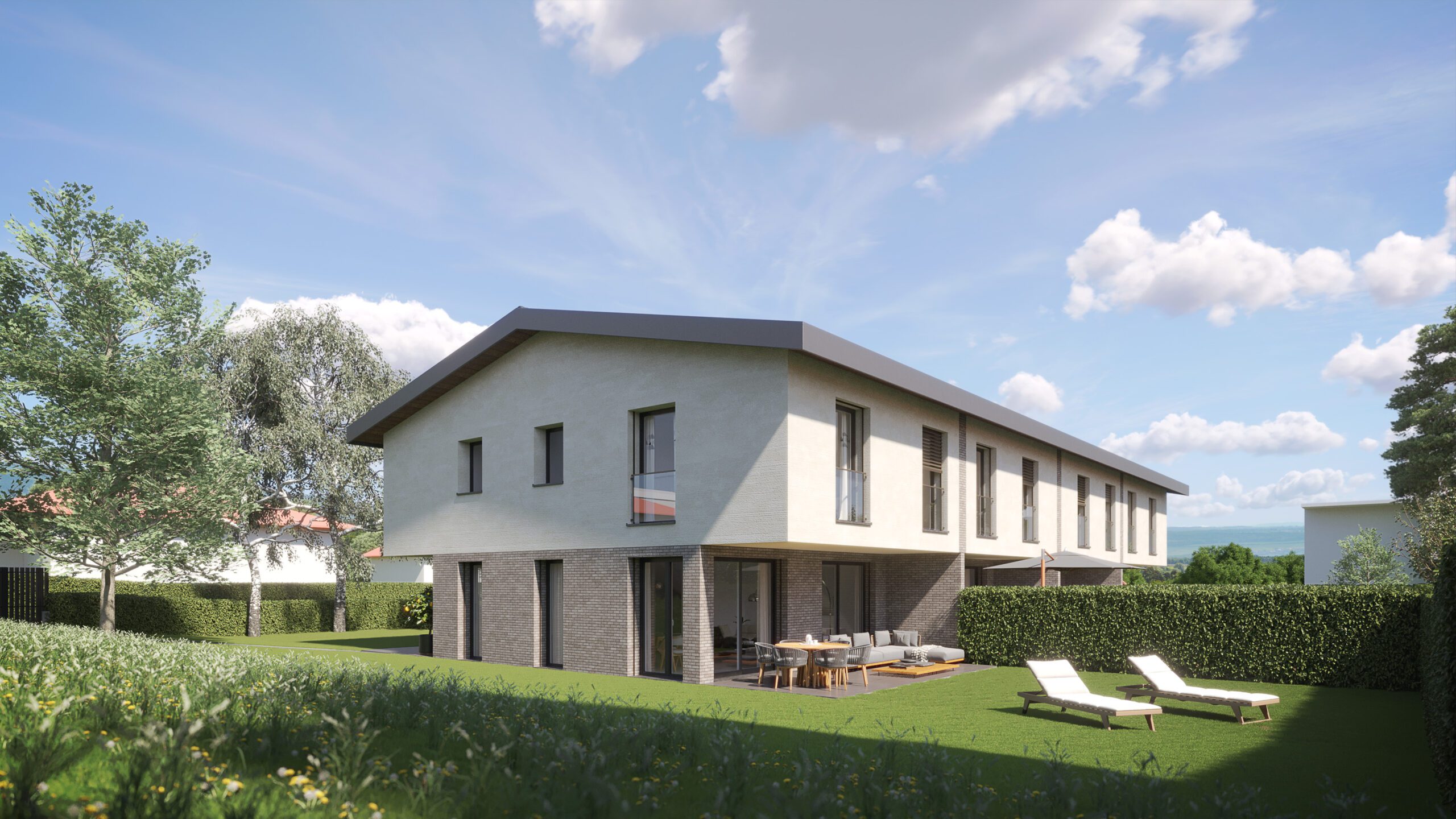 Réalisation de différentes vues de quatre villas contiguës situées chemin de la Ranchée 12 à Confignon (GE). Réalisation d’images extérieures et intérieures ainsi que des plans coupes des différents niveaux.
