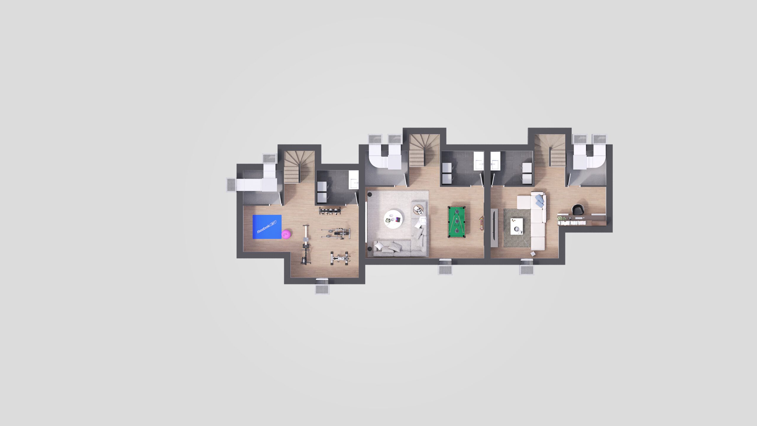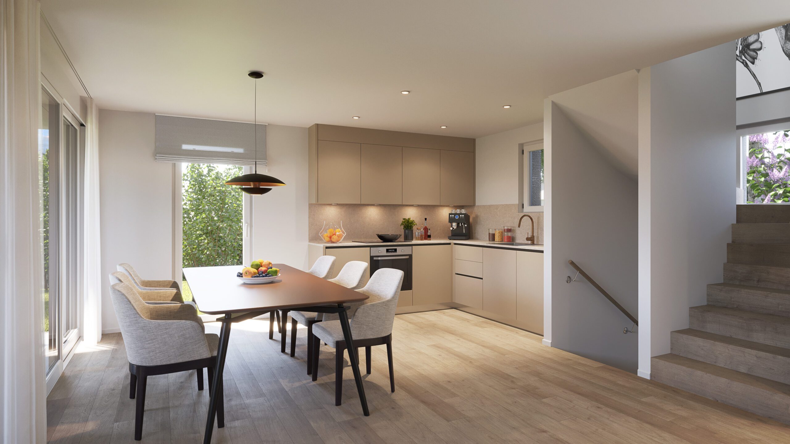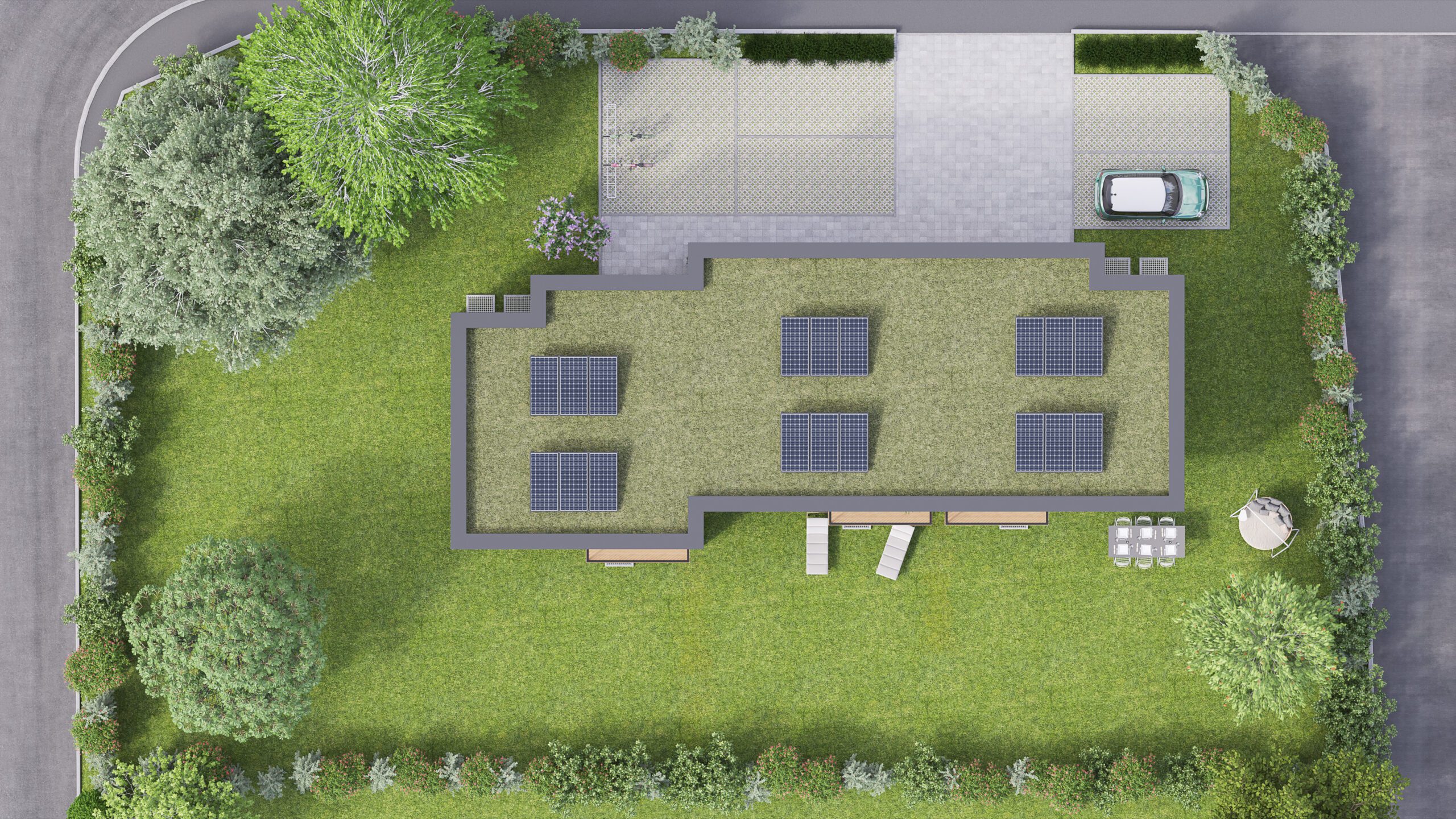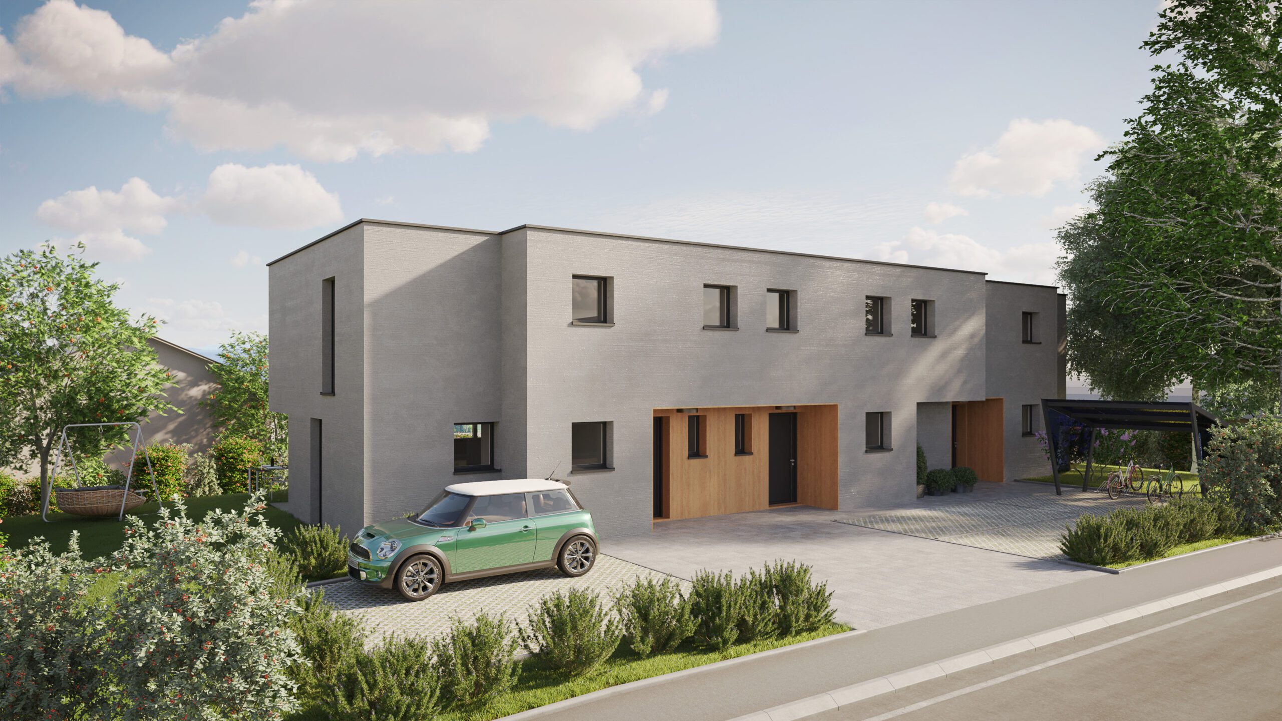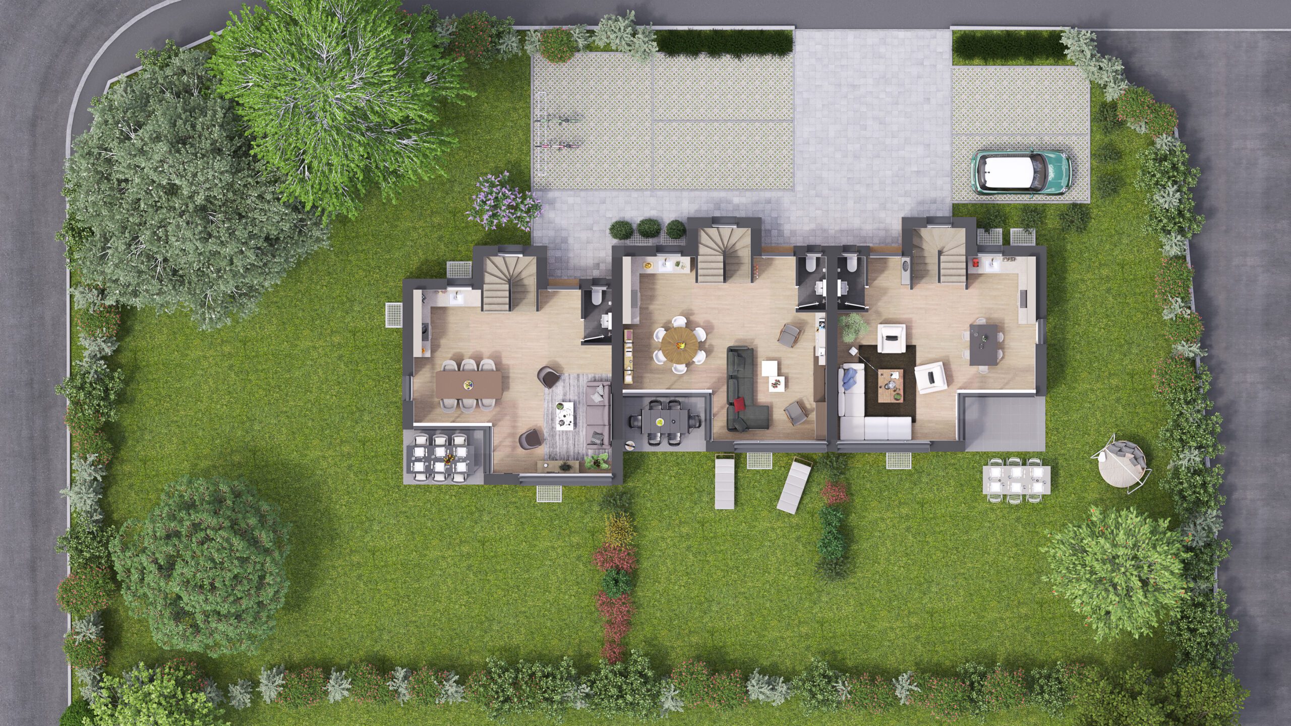 Réalisation de différentes vues de trois villas mitoyennes situées chemin de Vidollets 33 à Vernier (GE). Réalisation d’images extérieures et intérieures ainsi que des plans coupes des différents niveaux.